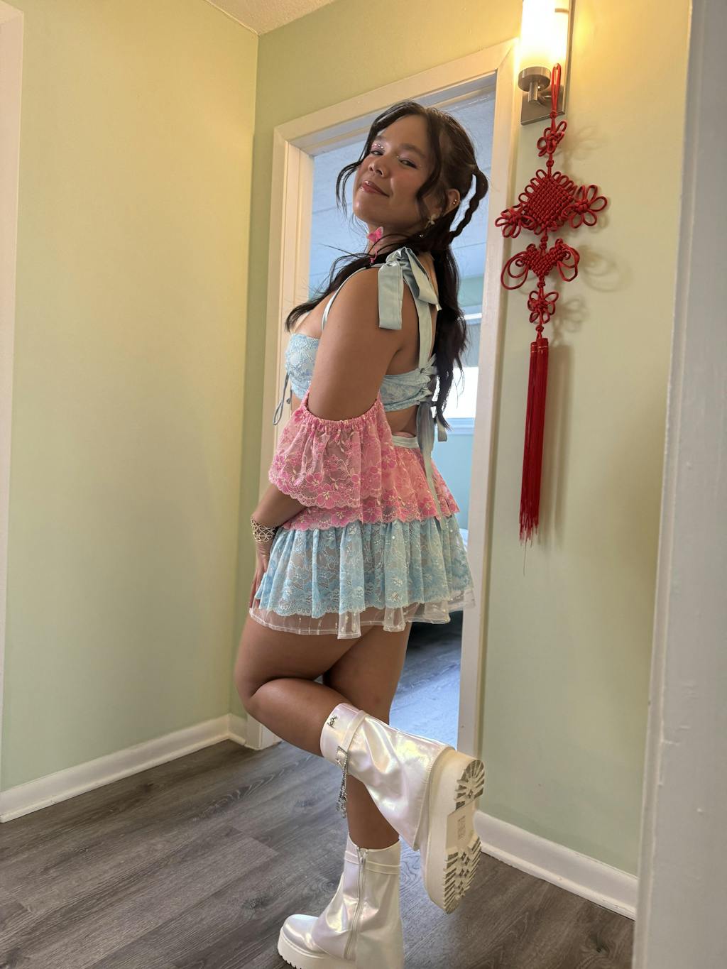 The outfit was so pretty! Got lots of compliments throughout the night! My only wish is that the overskirt ribbon was attached to the bikini- it kept sliding down, other than that it was so cute! Customer service was also great! Thank you!